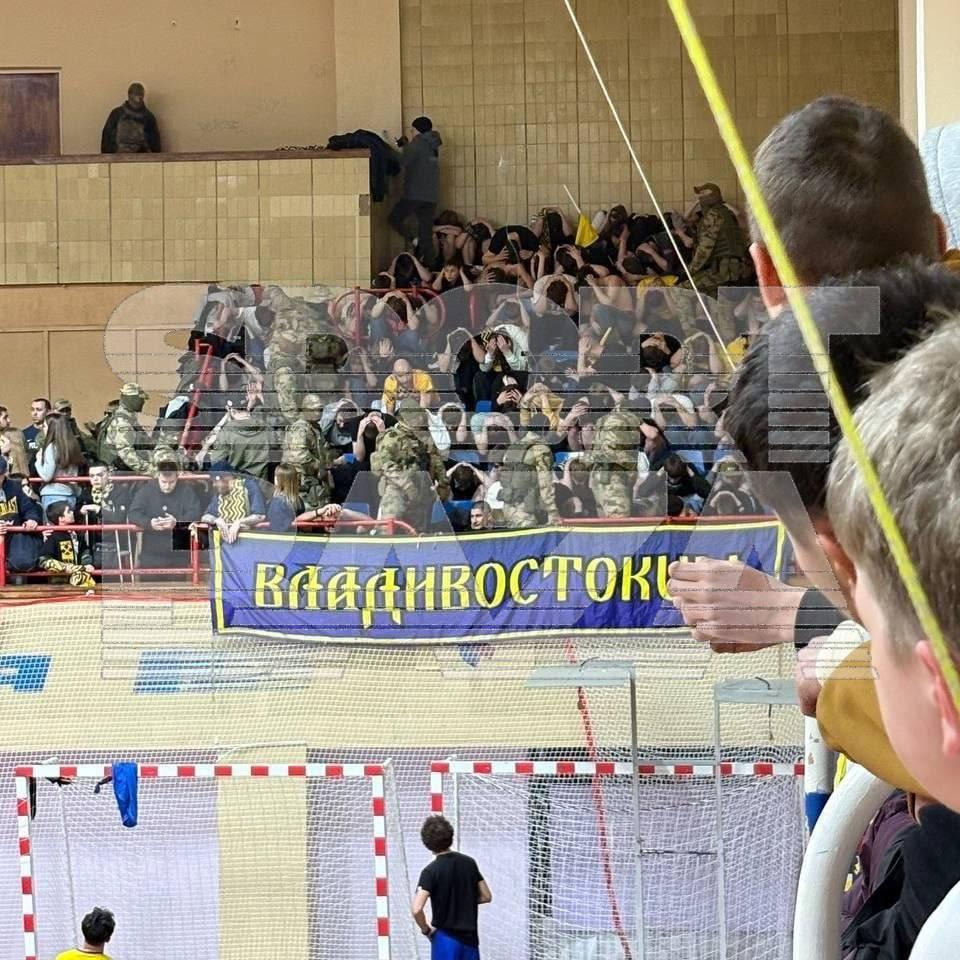 В спорткомплексе «Восход» во Владивостоке во время финала турнира по мини-футболу на трибуны ворвались вооружённые люди в военной форме и балаклавах.