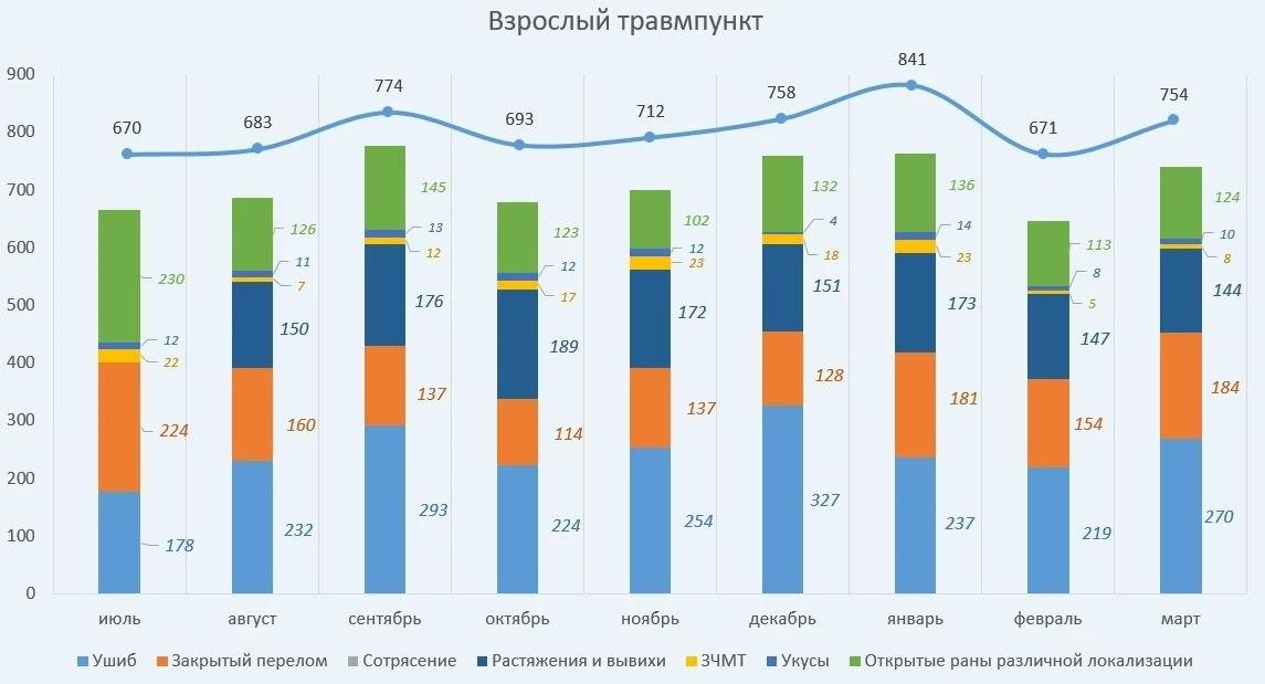 За прошедший месяц взрослый травмпункт принял 754 пациента — это на 83 человека больше, чем в феврале.