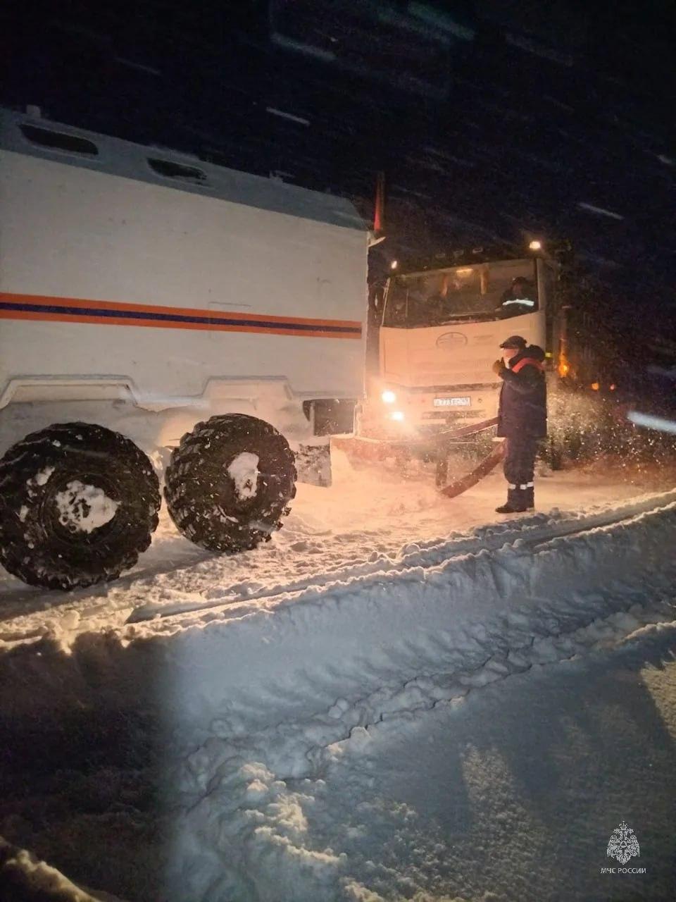 На трассу выехали спасатели МЧС на КАМАЗе и сотрудники областного пожарно-спасательного центра на вездеходе «Кречет».